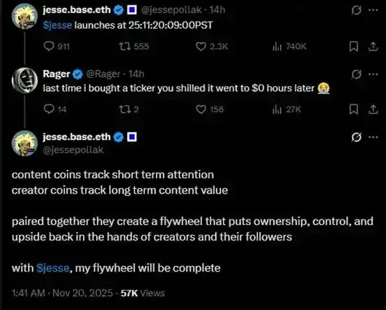 Jesse 为什么要推出他的个人代币?他个人在 X 上的说法是,「内容币追踪短期关注度,创作者币追踪长期内容价值。两者结合,形成一个飞轮效应,将所有权、控制权和收益权重新交还给创作者及其粉丝。有了 $jesse,我的飞轮效应就将完成。」