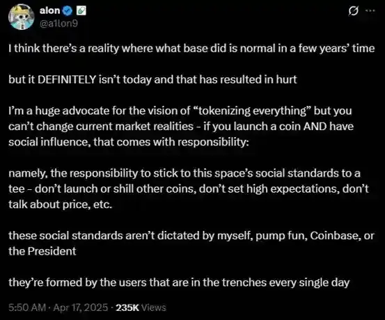 值得一提的有趣插曲是,当时 pump.fun 的创始人 alon 跳出来指称所谓万物皆可内容代币化是对市场的伤害,尤其对有影响力的人来说,发行代币意味着需要承担相应的责任,这是链上不成文但具有默契的规则。