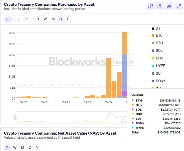 截至 2025 年第三季度末,全球公开披露的非比特币 DAT 财库总规模已突破 240 亿美元,环比 Q2 增长约 65%。结构分布如下:
