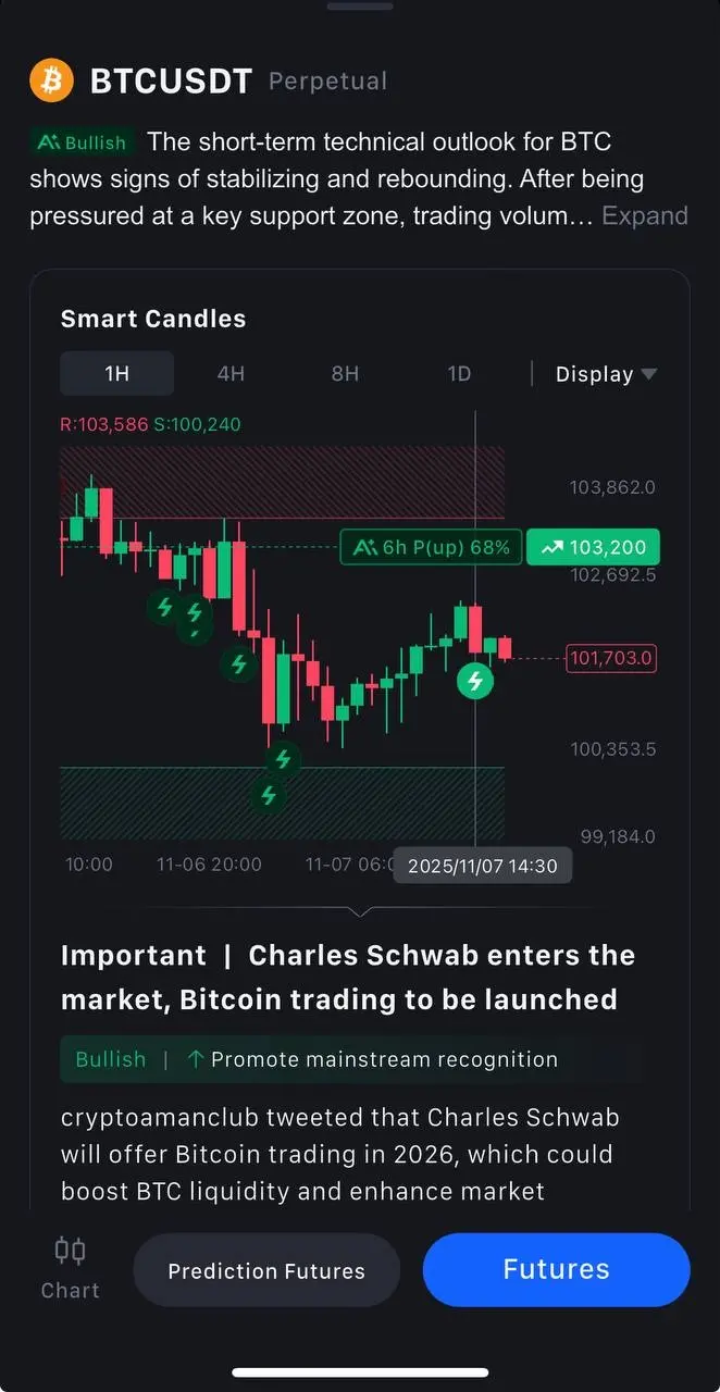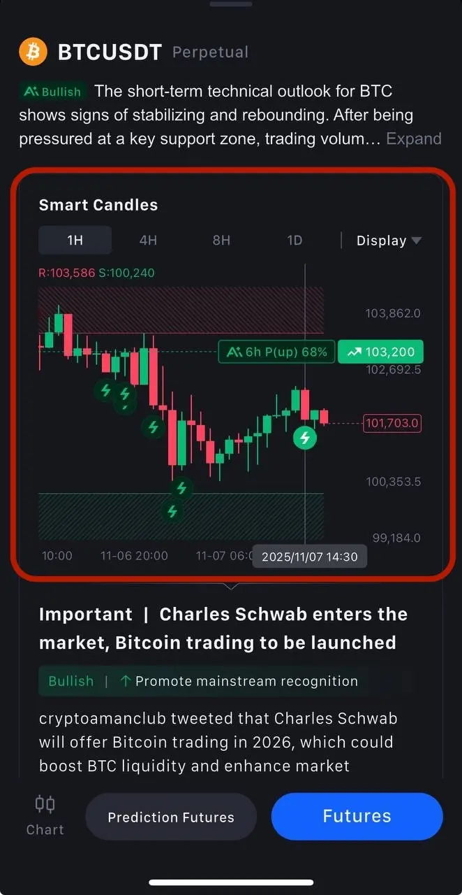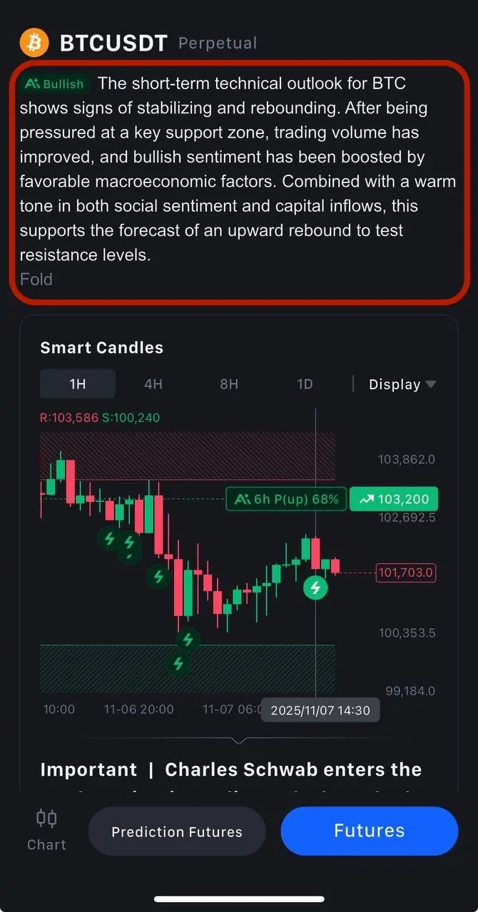 告别追涨杀跌:AI 智能 K 线一图读懂后市许多交易者的日常典型场景是:看到某币拉盘15%,匆忙在X平台搜利好、看大佬分析、翻链上数据,返回交易所再瞄一眼K线,感觉还要涨,fomo买入,最终挂在山顶。 信息碎片化和看不懂行情,是散户交易的典型困