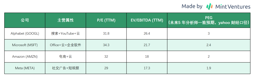 EV/EBITDA 为四者中最高,反映出市场对其盈利质量与 AI 把握能力给了接近“软件巨头 基础设施”的定价;