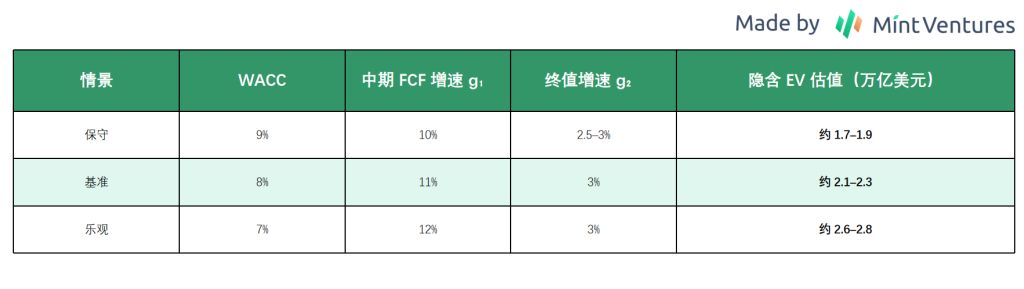 在较为传统的假设(WACC 8–9%、中期 FCF 增速 10–11%)下,基于目前高资本开支周期的数据,DCF 给出的合理 EV 区间多落在 2–2.3 万亿水平,明显低于当前 3.8 万亿 EV,具有较强的保守性;