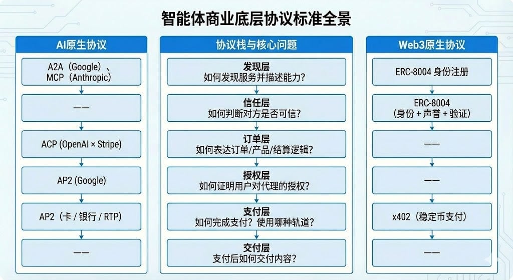 智能体商业(Agentic Commerce)是由机器主导的一套全新经济秩序的建立。它不是“AI 自动下单”这么简单,而是一整条跨主体链路的重构:服务如何被发现、可信度如何建立、订单如何表达、权限如何授权、价值如何清算、争议由谁承担。A2A、MCP、ACP、AP2、ERC-8004 与 x402 的出现,把“机器之间的商业闭环”标准化。