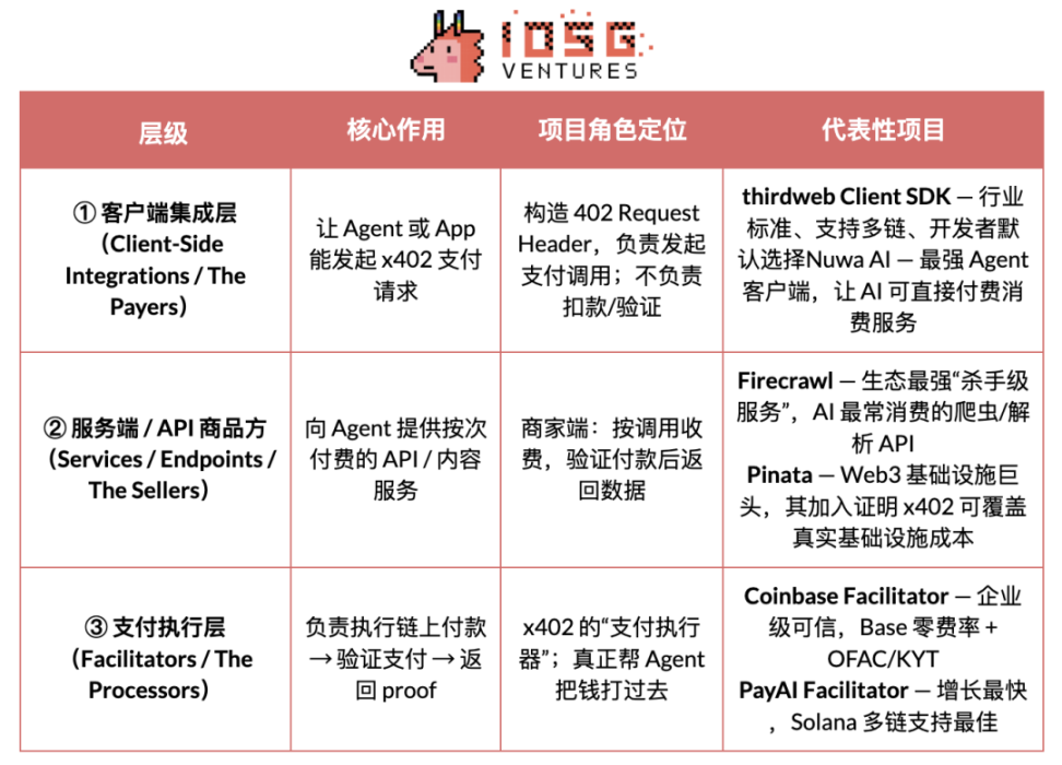 支付执行层(Facilitators / The Processors):完成链上扣款、验证与结算,是 x402 的核心执行引擎,代表项目:
