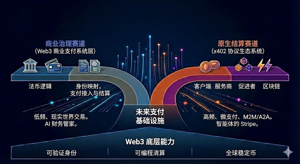 沿着这条演化路径,未来的支付基础设施将分化为两条平行轨道:一条是基于传统法币逻辑的业务治理轨道,另一条是基于 x402 协议的原生结算轨道。这两者之间的价值捕获逻辑并不同。