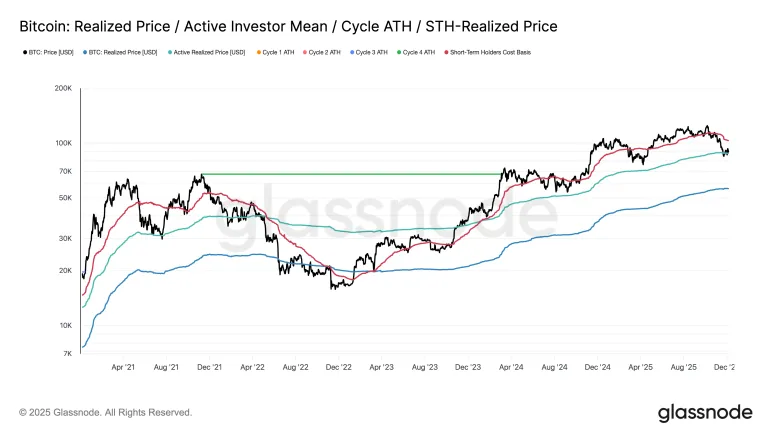 同时,关注短期持有者成本和活跃已实现价格之间的关系。如果短期线跌破活跃线,风险会迅速增加。目前,这种不利的交叉还没有发生。