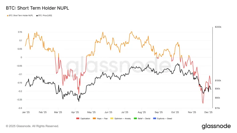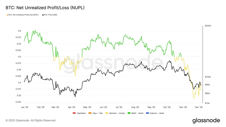 NUPL为0.36,刚好在公允区域内。短期持有者NUPL为-0.155。新买家处于亏损状态。一旦价格触及其成本,他们就会卖出。这证实了市场情绪的疲弱。