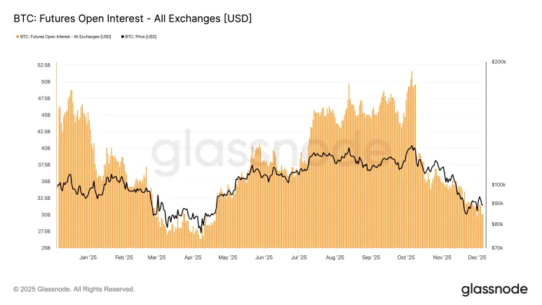 期货市场的未平仓合约(OI)已回落至4月低点。这一下降表明狂热的杠杆赌注已被清除。