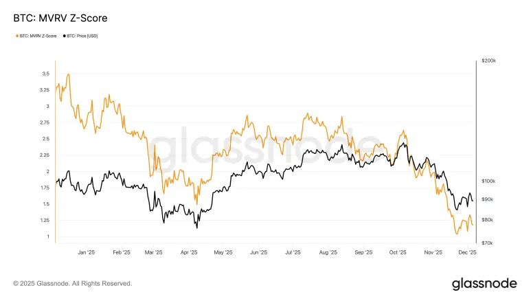 MVRV Z-Score位于1.17。它离开了便宜区域,但上行幅度有限。此处买家和卖家交织,增长放缓。趋势疲软且不明朗。