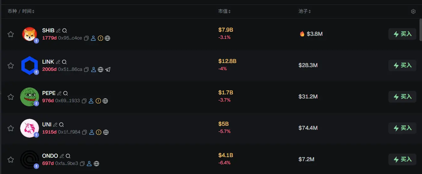 过去 24h ETH 热门代币前五依次为:SHIB、LINK、PEPE、UNI、ONDO