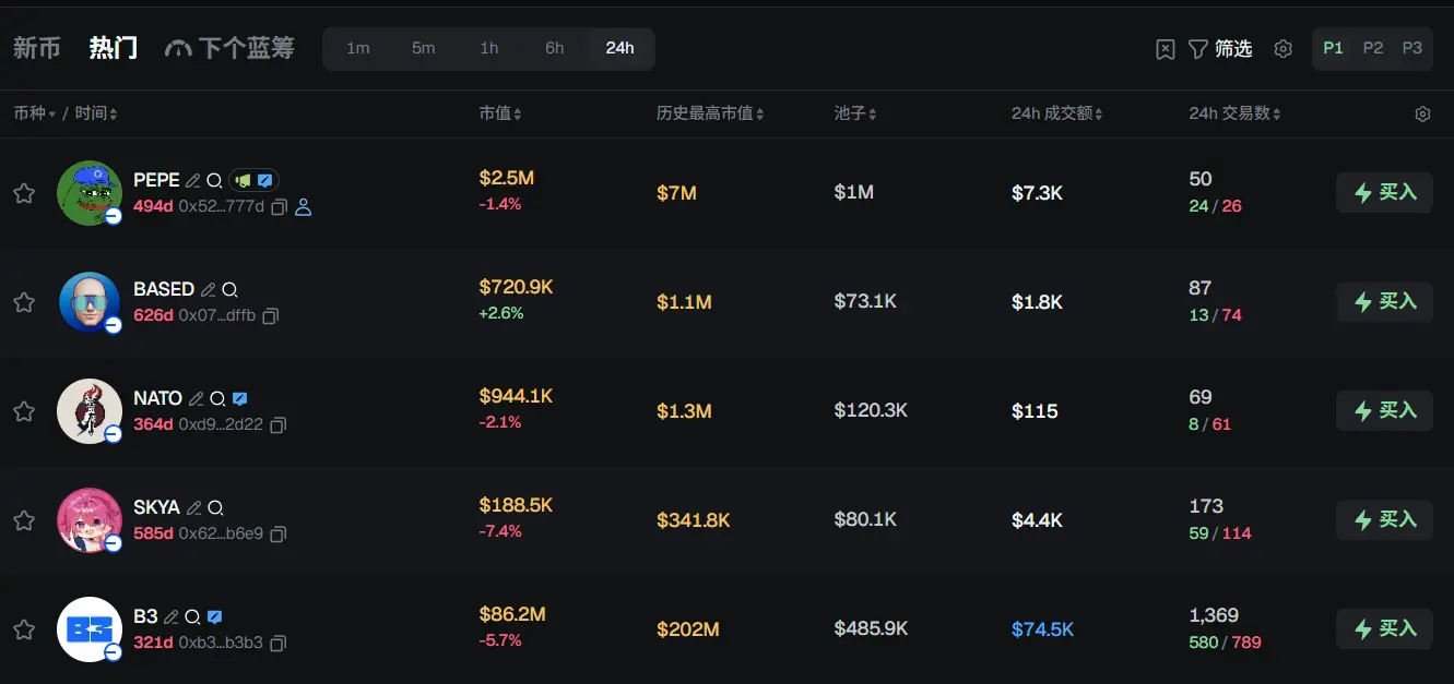 过去 24h Base 热门代币前五依次为:PEPE、BASED、NATO、SKYA、B3