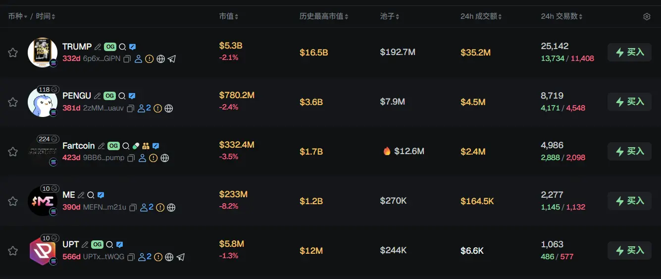 过去 24h Solana 热门代币前五依次为:TRUMP、PENGU、Fartcoin、ME、UPT