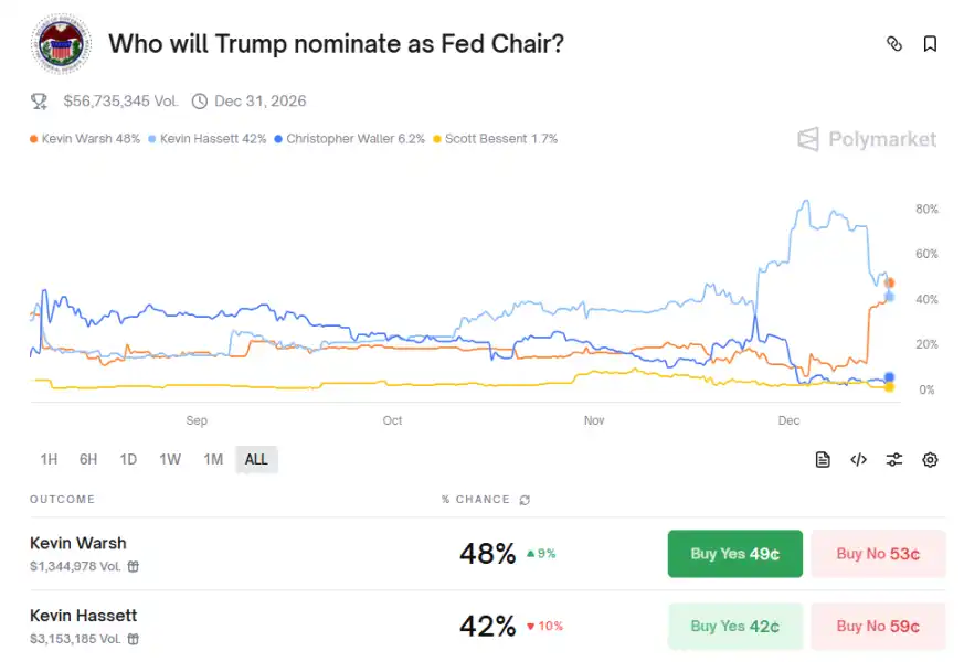 12 月 16 日,华尔街见闻提及,美国总统特朗普接受媒体采访时称,前美联储理事凯文·沃什已与凯文·哈塞特并列,成为美联储主席候选名单中的领先人选。他表示: