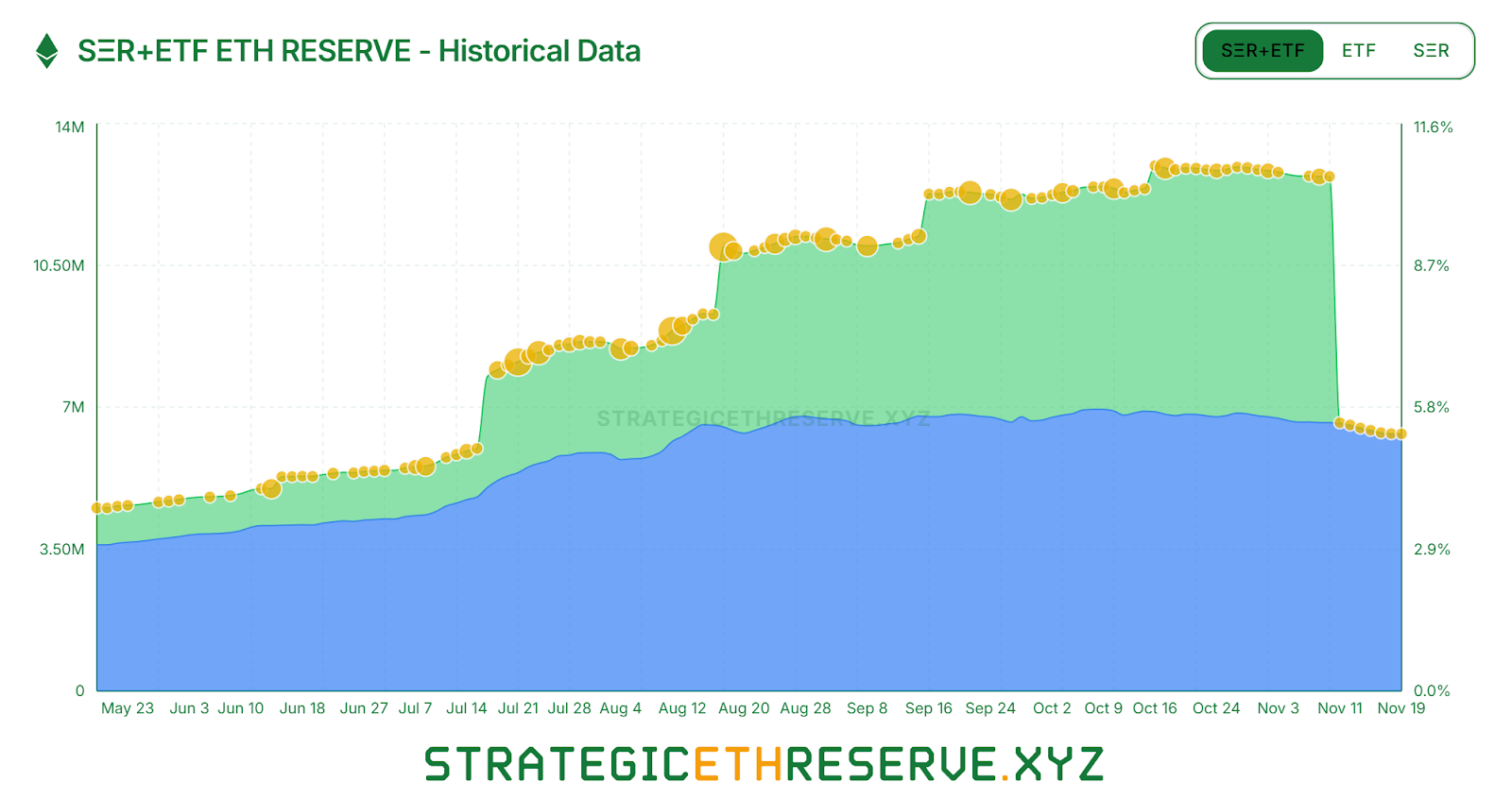 2.ETF资金流出:根据SoSoValue数据,11月中旬以太坊现货ETF总持仓规模约634万枚(192.8万亿美元),占ETH供应量的5.19%,但本月资金已由净流入转为净流出,月内撤资规模显著高于新进资金,单日最大流出额高达1.8亿美元。这与7-8月ETF每日稳健吸金形成鲜明对比。ETF投资者多为中长期配置,连续数日净赎回,意味着传统金融渠道对ETH的需求增量在减弱,其撤离不仅直接减少买盘,还可能放大短期波动性。