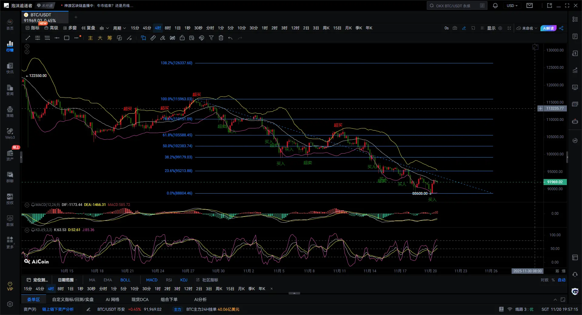 先讲技术这块,行情现在走到末端收敛状态,随时可能要挑方向走了。第一点看斐波那契回调,目前价格正踩在黄金分割的关键区域。从走势看,比特币从前期高点跌下来,目前在23.6%附近,大约在91270的位置反复震荡,下面关键的支撑位在0%,大概是88800。目前价格卡在23.6%附近来回波动,这属于典型的“大级别趋势末期、小级别震荡筑底”的动作。简单说,现在就是在震荡磨底,一旦放量突破了下降趋势线,反弹空间就被打开了。