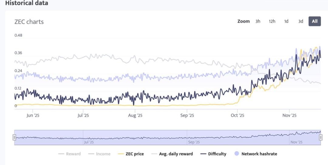 过去两个月,ZEC 的高收益正在快速吸引算力进场,全网 hashrate 开始显著增长, difficulty 也已经进入升高周期。从图表可以清楚看到,ZEC 的 price(黄色线)在 9 月底开始脱离横盘状态,而 hashrate(淡紫色)与 difficulty(深蓝色)随之出现同步抬升。这一段走势意味着挖矿端已经开始对价格上涨做出反应。