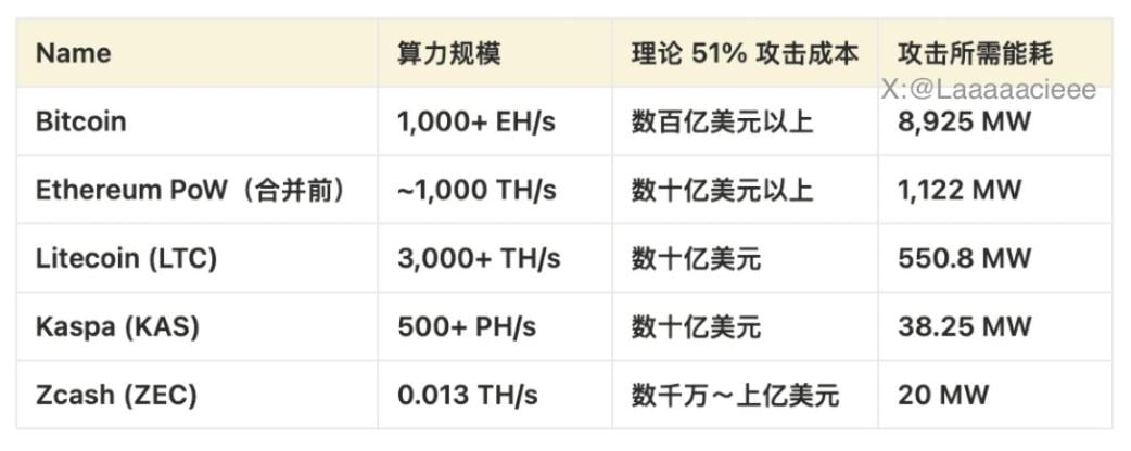 在挖矿经济模型之外,另一条决定性风险线是网络的安全性与算力规模。对于 PoW 链而言,「全网算力规模 51% 攻击成本」直接决定其能否在高估值状态下自洽。
