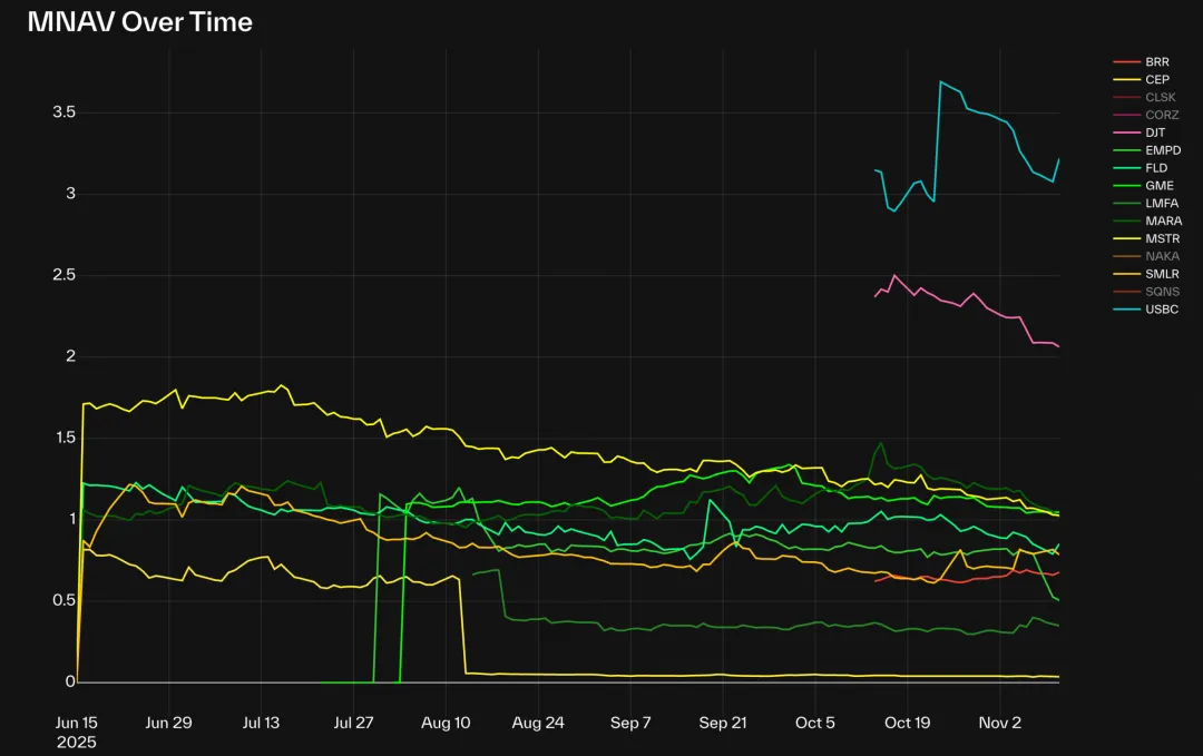 截至今日,在 BTC DAT 类别中,Strategy (MSTR)、GME 和 MARA 在近期市场调整后均接近 1.0。但大多数其他 BTC DAT 的 mNAV 均低于 1.0,其中 EMPD 最低,约为 0.5。