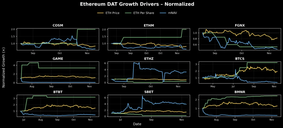 ETH DAT:作为类别先行者,ETHZ 和 SBET 受益于最初市场情绪上涨,尽管每股 ETH 相对平稳。此后,BMNR、ETHM、BTCS、BTBT 和 GAME 的每股价值均稳步增长,尽管它们的 mNAV 增长呈下降趋势——可能表明它们在市场周期顶部附近推出。FGNX 是例外,经历严重股权稀释和市场情绪急剧下滑,导致表现显著逊于预期。
