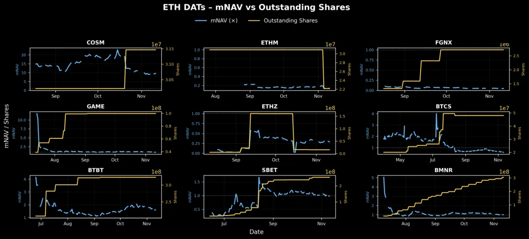 从上图可以看出,ETH DATs 在股权发行和市场情绪管理方面存在明显差异。大多数公司呈现流通股数量逐步增加趋势——表明可能进行 PIPE 或 ATM 发行。