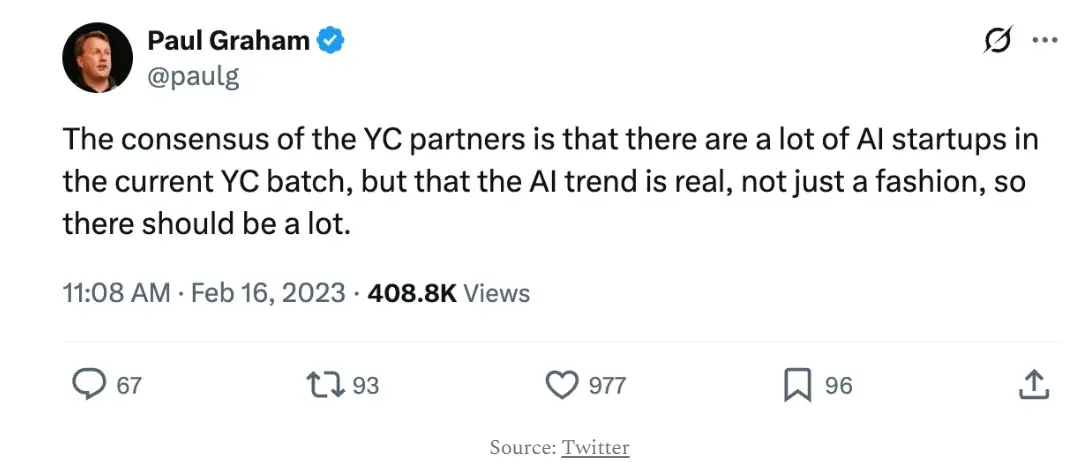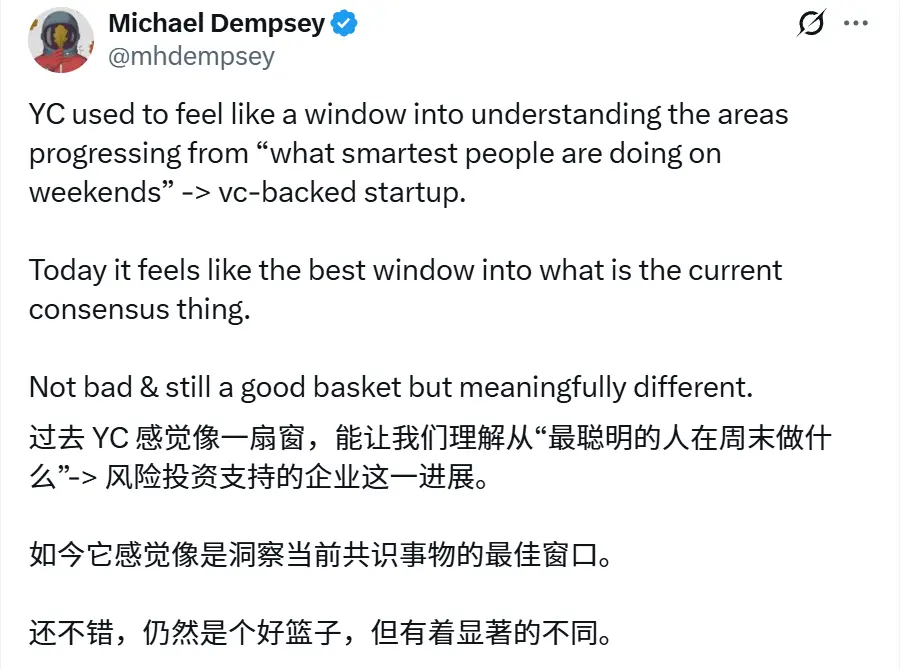 这就是 Dempsey 的评论。YC 正在成为“窥见当前主流共识的最佳窗口”。