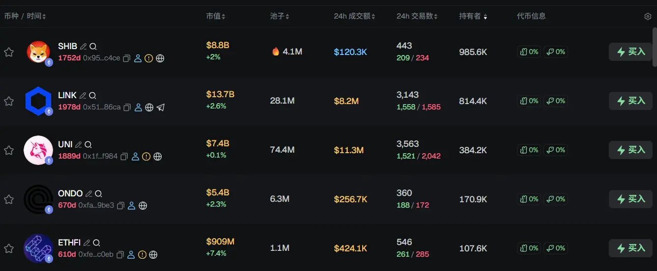 过去 24h ETH 热门代币前五依次为:SHIB、LINK、PEPE、ONDO、ETHFI