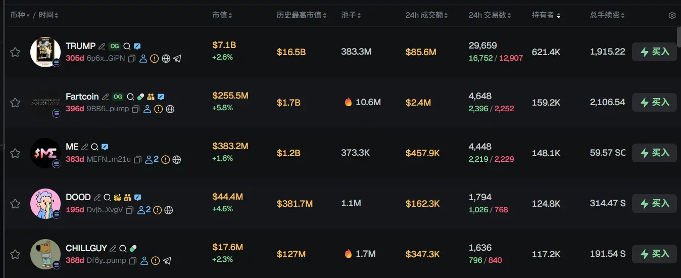 过去 24h Solana 热门代币前五依次为:TRUMP、Fartcoin、ME、DOOD、GHILLGUY