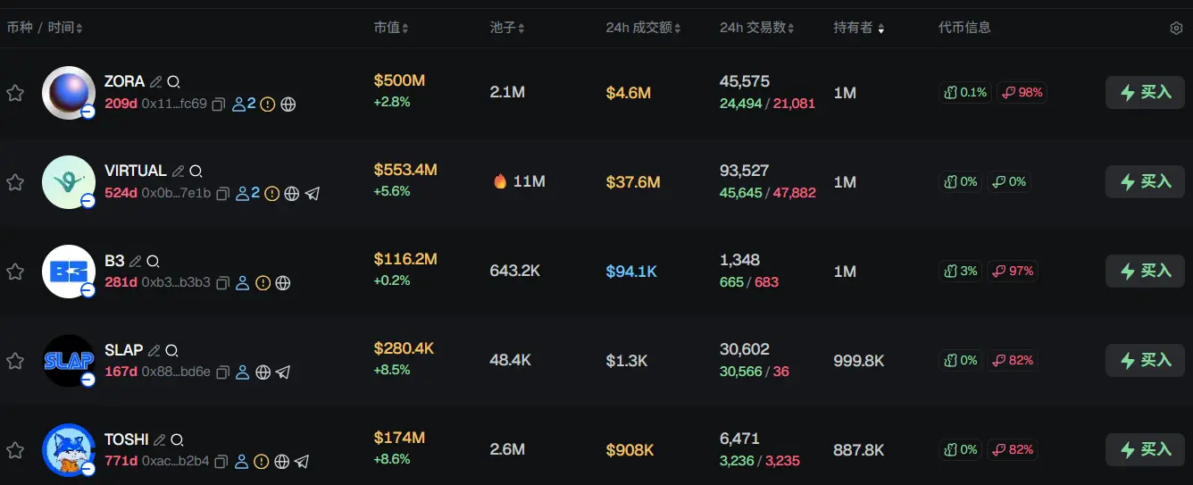 过去 24h Base 热门代币前五依次为:ZORA、VIRTUAL、B3、SLAP、TOSHI