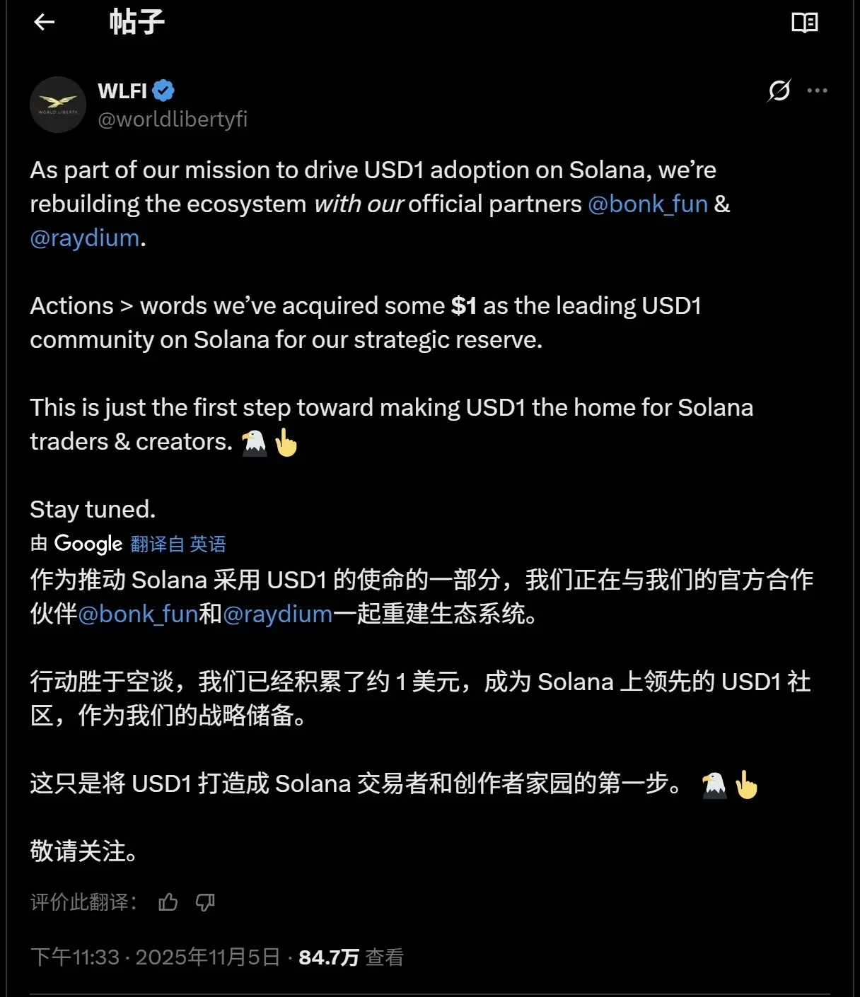 Bonk 与 Raydium 的最新合作是 WLFI 迄今为止最积极的扩张举措。通过此次合作,USD1 将整合到 Bonk.fun 的 memecoin 发行平台和 Raydium 的自动做市商池中,使代币创建者可以选择将新发行的代币与 USD1 配对,而不是传统的 USDC 或 USDT 等替代币种。此次整合还支持通过平台界面和第三方交易机器人进行 USD1 交易对,显著提升了 Solana 用户的交易便利性。