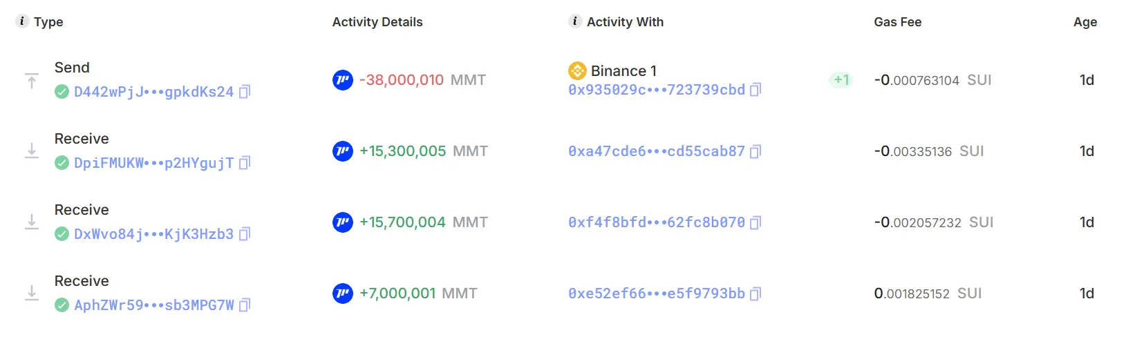紧接着,MMT 价格从高点大幅回落至不足1美元,回撤幅度超80%。据 Suiscan 数据显示,Momentum 团队关联地址 0xe7cd…7a88a4向币安转入了 3800 万枚 MMT 代币,价值约 4560 万美元。这批代币来自第二大持币地址 0x1b4d2…7355c8,该地址持有 MMT 总供应量的 18.57%,这一抛售行动引发市场恐慌。