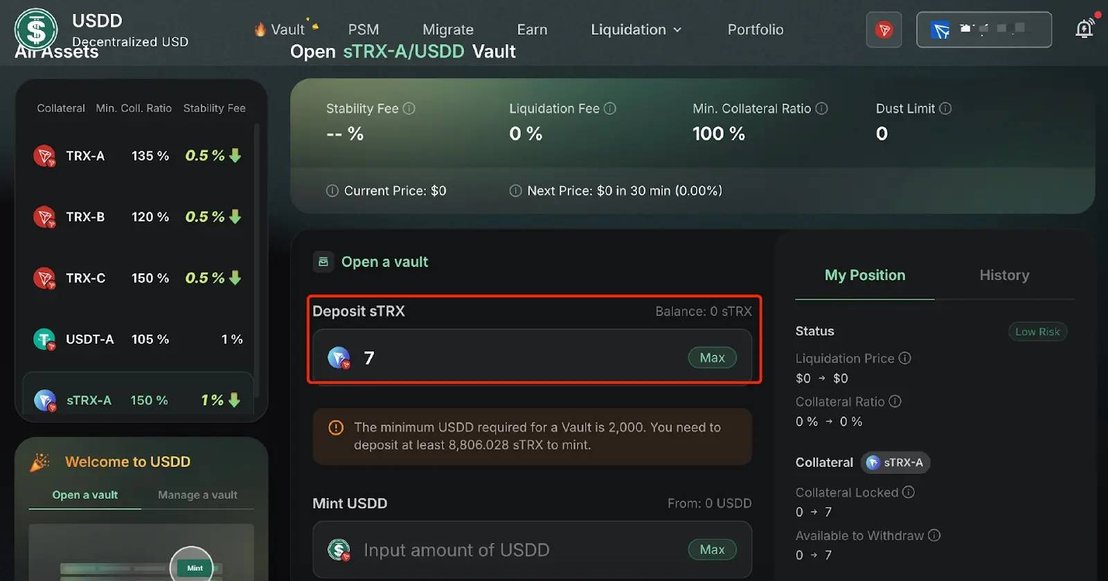 将持有的sTRX作为抵押品存入,以铸造USDD。在“Deposit sTRX”输入框中输入想要存入的sTRX数量,并在钱包中授权确认。需要注意的是,USDD的最低铸造量是为2000,需要存入至少约8,806.028 sTRX 才能进行铸币。此过程为超额抵押,需要注意维持稳定的抵押率。