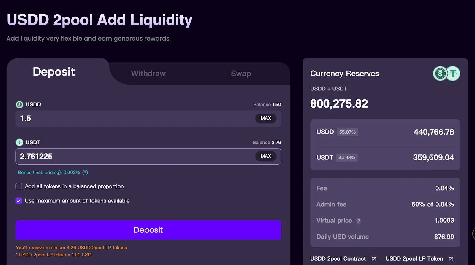 2、在输入框中输入想要添加的代币数量,点击下方的“Deposit”按钮,并在钱包中确认授权。