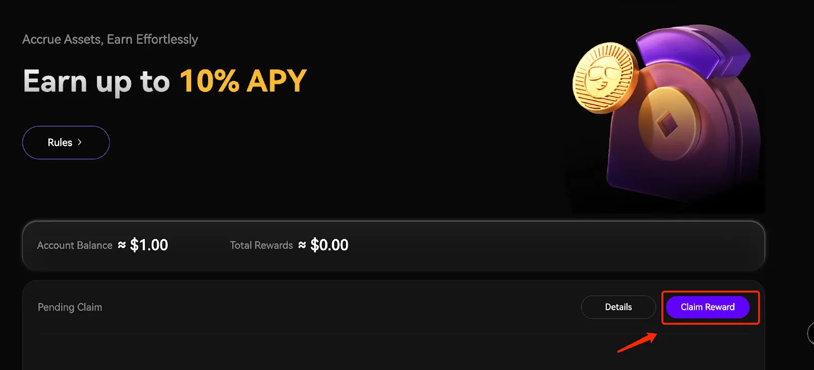 3、领取收益:奖励将于 T 2 日 09:00 (UTC) 以 USDT 形式发放。例如:如果用户在 1 月 1 日存入 USDT,则将在 1 月 2 日进行资产快照以计算收益,奖励将在 1 月 3 日 17:00 (UTC 8) 发放。点击下方“Claim Reward”按钮即可领取收益。