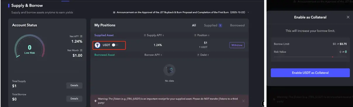 1、抵押资产:用户如果需要从JustLend中借出某种资产,首先需要在JustLend上进行存款,随后将存储代币进行抵押,即可从协议中借出任何支持借出的资产,随借随还,利率由协议的利用率(即当前借入的流动性占总流动性的百分比)决定。存款后,用户可在SBM页面上方的“My Positions”栏点击“开启”按钮,将资产进行抵押。