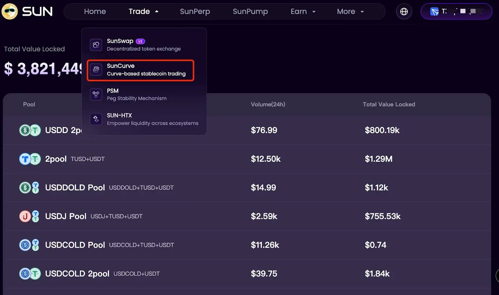 1、在导航栏中选择“Trade”>“SunCurve”,进入添加流动性页面,选择想要添加的流动性池。