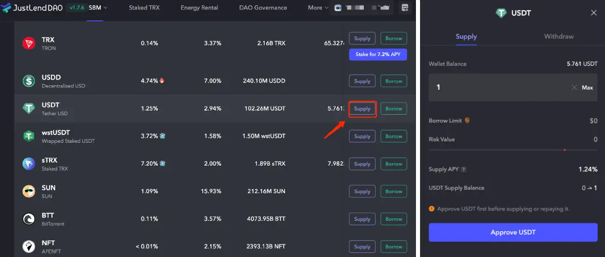 1、选择想要存储的代币,如USDT,点击Supply,在弹出的页面中输入代币数量,点击“Approve USDT”并在钱包内签名授权。