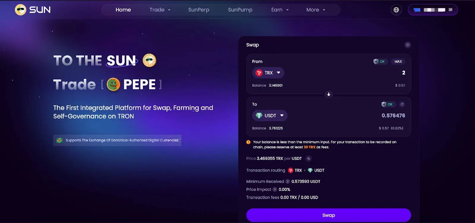 在“Swap”界面,用户可以进行BTC、USDT、TRX、SUN、JST、BTT、NFT、WIN等代币之间的兑换。点击下拉按钮,选择想要兑换的币种,输入代币数量,点击“Swap”按钮并在钱包中授权即可。