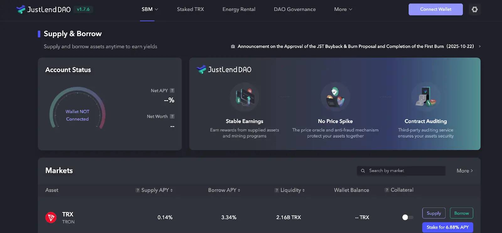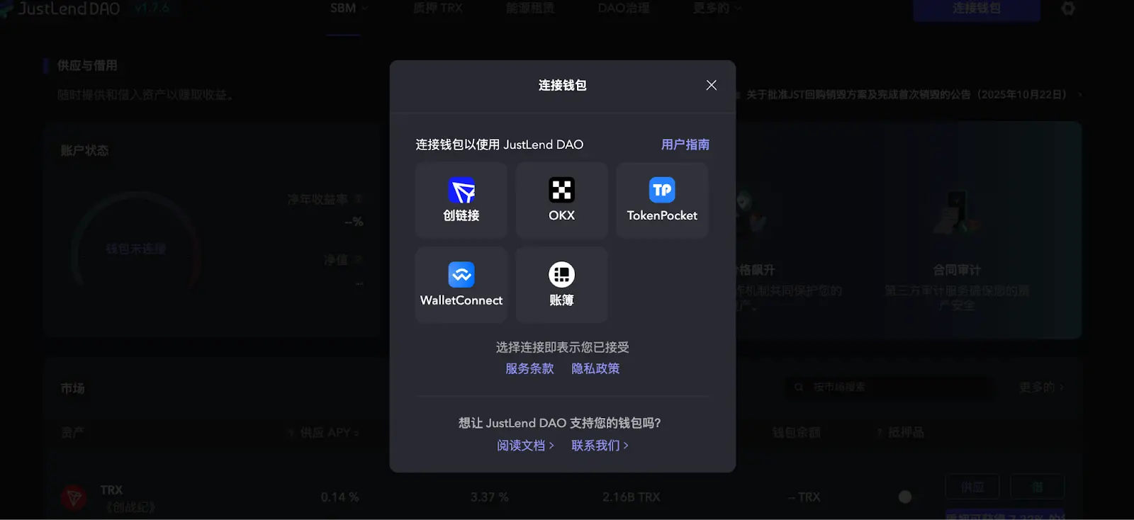 1、访问JustLend DAO官网(https://justlend.org/),连接支持波场TRON网络的钱包,如TronLink。