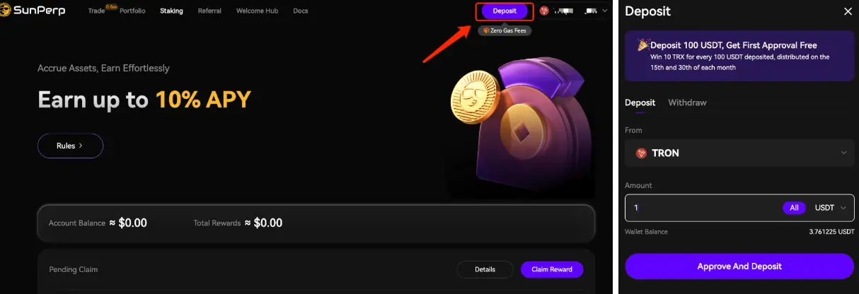 1、准备工作:访问 SunPerp 官方网站(https://www.sunperp.com/),并连接钱包(如TronLink),进入“Staking”页面。