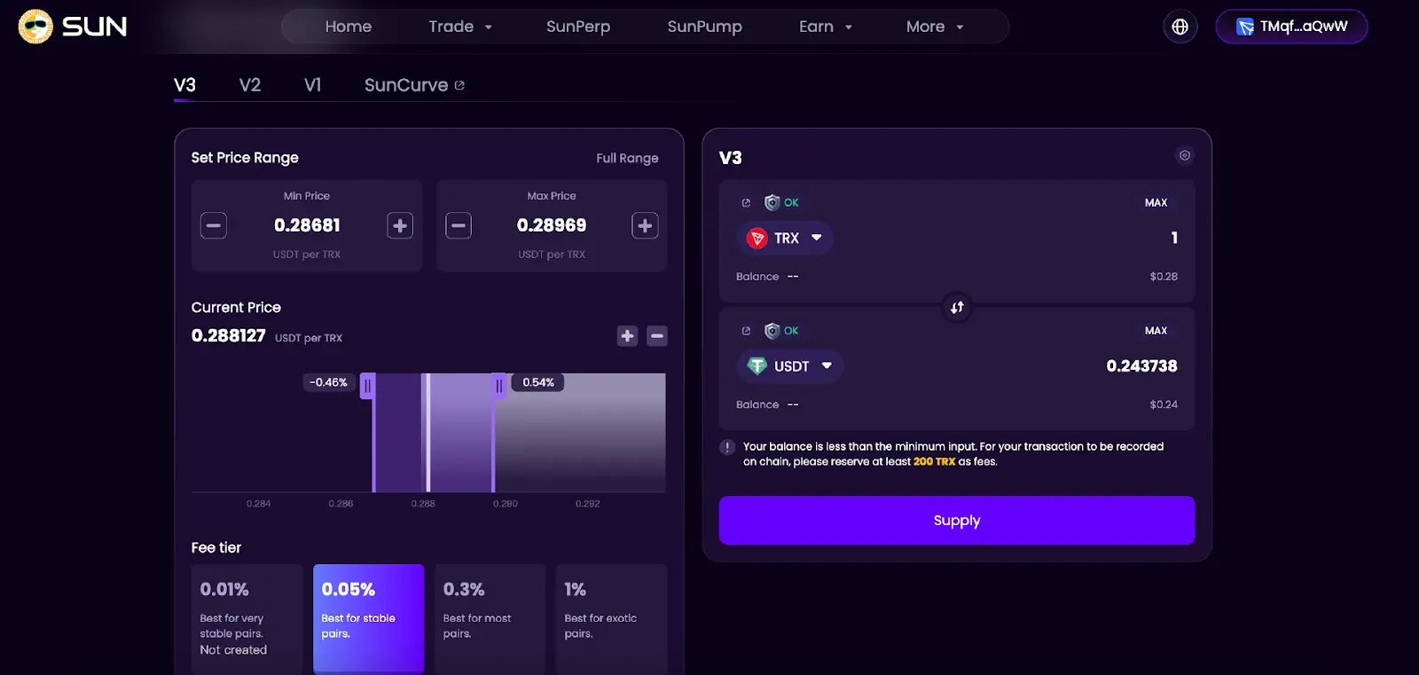 3、在输入框中输入想要提供的资产数量,另一个输入框将根据两种代币之间的汇率自动填充数值。随后,在左侧框中设置价格范围并选择合适的收费等级。点击“Supply”,并在钱包中授权。