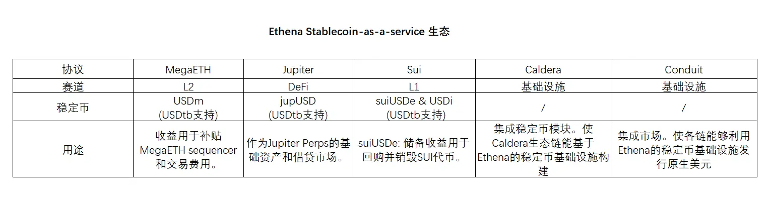 这套模式的核心逻辑并不复杂:合作方通过Ethena的基础设施铸造自己品牌的稳定币,获得底层抵押品产生的大部分收益,而它只收取少量协议费用。整个过程中,储备管理、审计合约、链上管道、托管与流动性基础设施、合规框架都由Ethena提供,合作方只需选择backing mix(USDtb或USDe的组合比例),就能实现从0到1的发行。以Jupiter的jupUSD为例,它最初100%由USDtb(国债支持)backing,后续可根据需要调整为USDe(delta-neutral机制)以提升APY。MegaETH的USDm用USDtb储备来维持sequencer费用的稳定性和可预测性。Sui Network则推出suiUSDe和USDi,驱动$SUI回购和非EVM生态的DeFi增长。