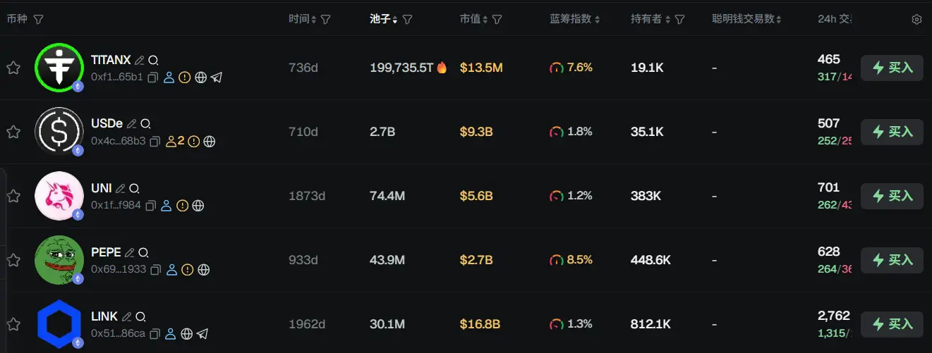 过去 24h ETH 热门代币前五依次为: TITANX 、 USDe 、 UNI 、 PEPE 、 LINK
