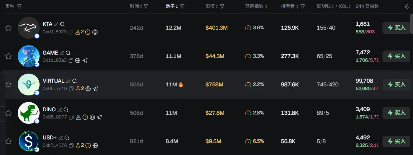 过去 24h Base 热门代币前五依次为: KTA 、 GAME 、 VIRTUAL 、 DINO 、 USD