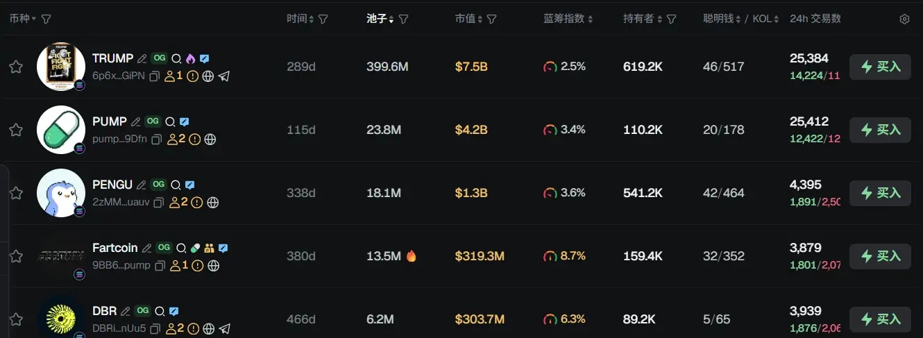 过去 24h Solana 热门代币前五依次为: TRUMP 、 PUMP 、 PENGU 、 Fartcoin 、 DBR