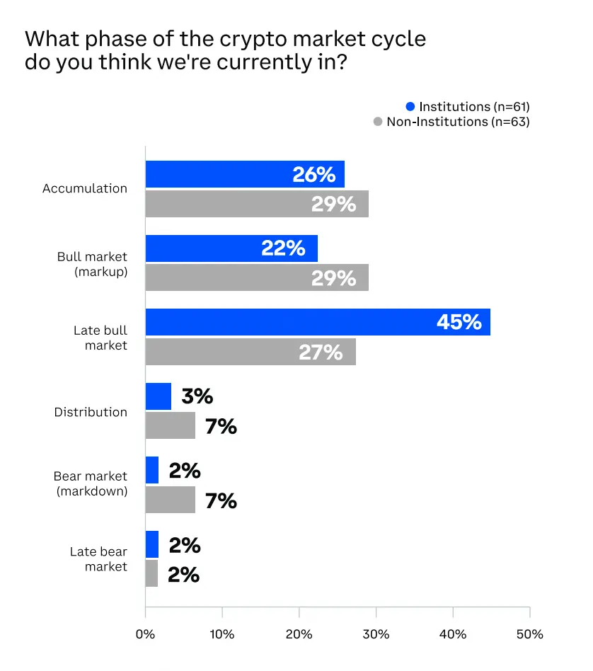 Coinbase在9月底针对120余家机构及散户投资者的调查显示,其中对于加密市场处于什么阶段的问题引人注目,其中高达45%的机构投资者已认为市场已进入牛市后期,同时非机构投资者该项选择占比也达到27%,相信经历了1011清算事件后,选择占比肯定会更向牛市后期以及顶部派发阶段集中。