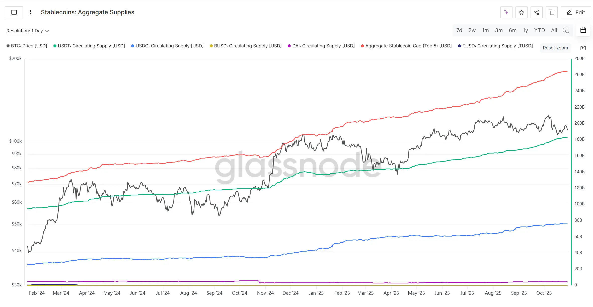 与此同时,主流稳定币供应量仍维持上升趋势,甚至在市场回调阶段出现小幅加速增发,表明链上资金仍保持增长势头,潜在流动性尚存。