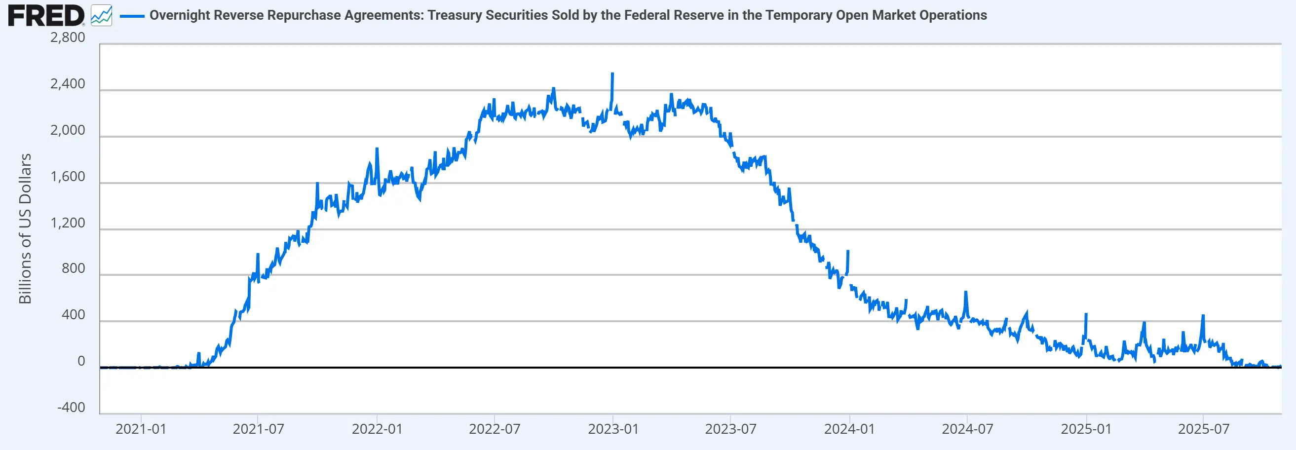 隔夜逆回购工具是美联储从市场回笼流动性的工具,与缩表协同管理银行准备金水平。通过数据可以看到自今年八月以来逆回购工具已被抽干,无法再释放流动性。