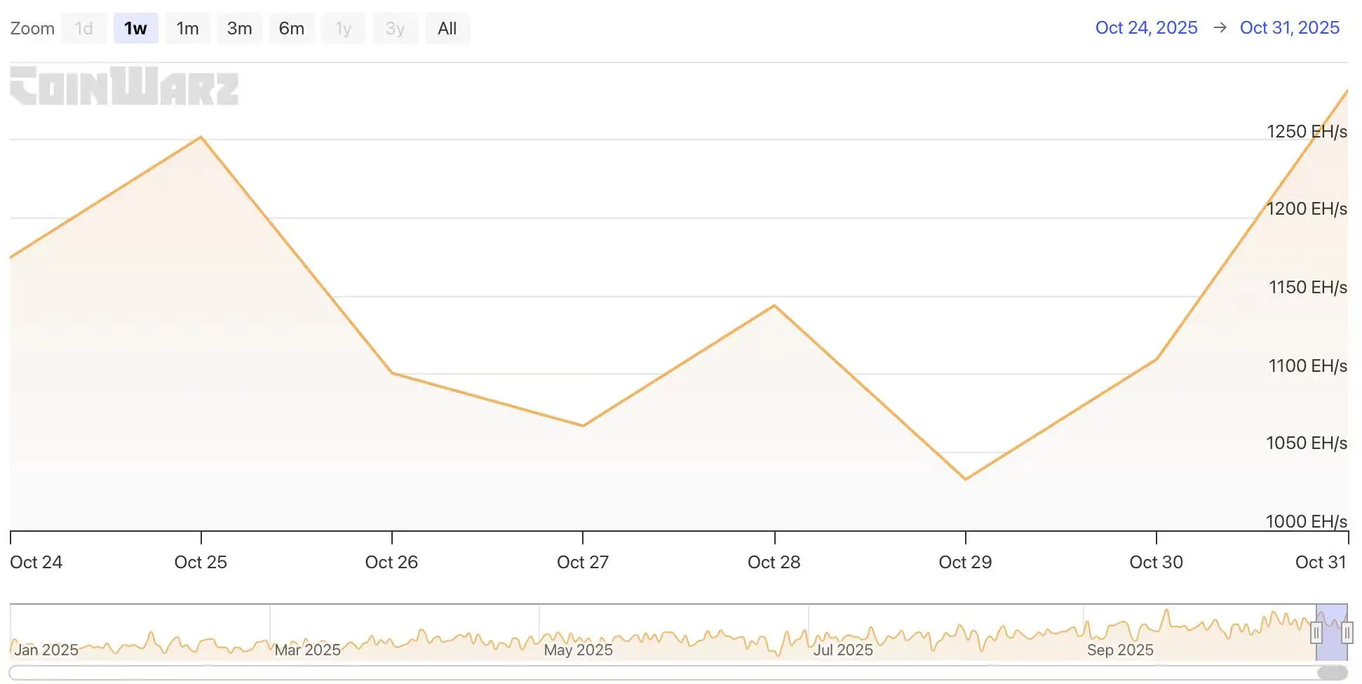 过去七天,比特币网络哈希率整体呈现波动,本周哈希率维持在 1032.58 EH/s 至 1281.76 EH/s 区间,处于相对高位。