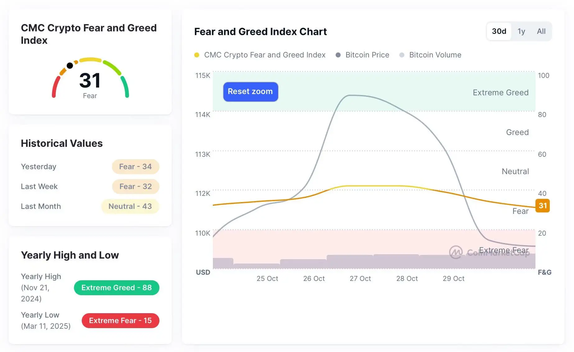 截至10月24日,恐惧与贪婪指数(Fear & Greed Index)报 31 点,位于“恐惧”(Fear)区间,显示市场整体情绪谨慎偏空。