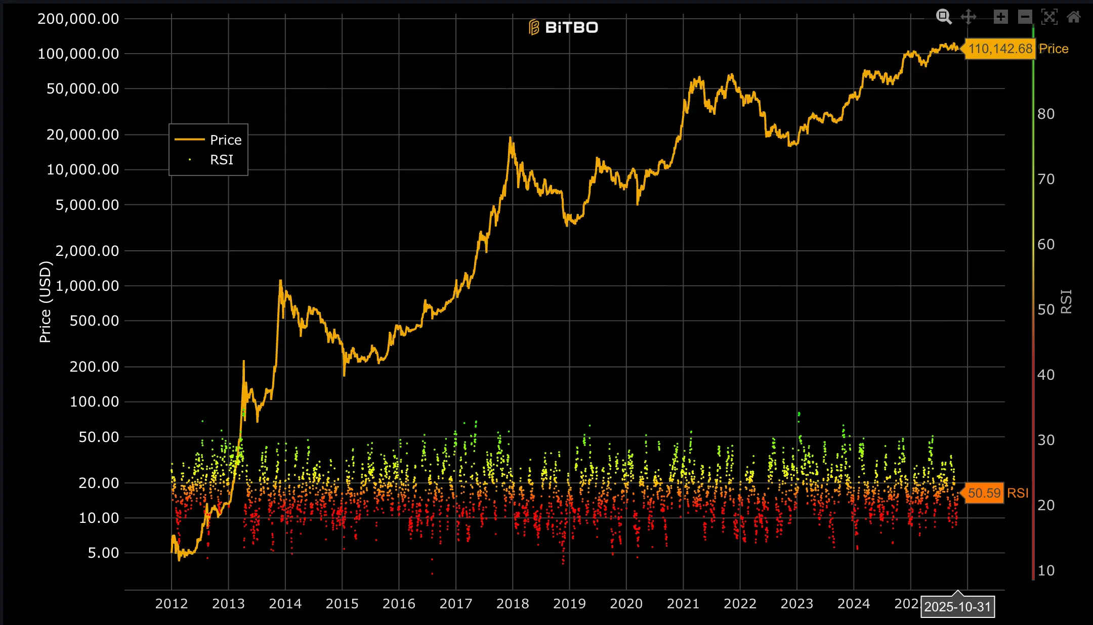 根据 Bitbo 数据,截至2025年10月31日,比特币 14 日 RSI 为 50.59 。RSI 指数处于中性区域(50 附近),既未显示明显超买(>70),也未显示超卖(<30),表明市场当前多空力量相对均衡。